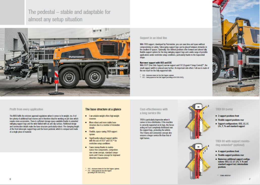 The M36 fulfils the strictest approval regulations when it comes to its weight, too. It offers plenty of additional load reserve and is therefore ideal for working on job sites which require more accessories. There is sufficient storage space available thanks to extended swinging support legs and the wide flatbed with an anti-slip surface. Additional design and construction details make the base structure particularly robust: The clamping length of the front telescopic support legs and the boom pedestal, which is compact and made of a single piece of material.